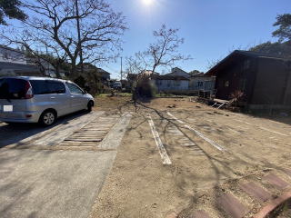 敷地188坪 東側道路に面した整形地 駐車場4、5台分 東南側に日当り良い菜園用地