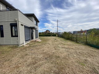 南側から西側にかけてシンプルに広い庭 中央で分割して西側半分は別目的で利用可能