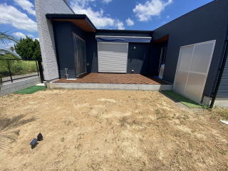 南側にリビングから続く広いテラスと日当り良い庭 南方向には田園風景広がり見晴らし良好