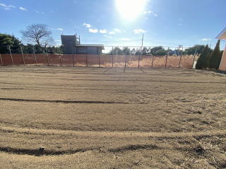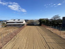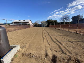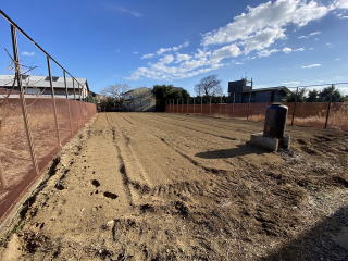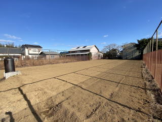 西側敷地入口側に広い駐車場 東側敷地半分以上に広く明るい庭 テニスコートも入るサイズ