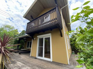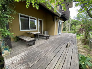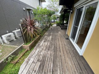 南側の庭の様子 広いウッドデッキの庭
