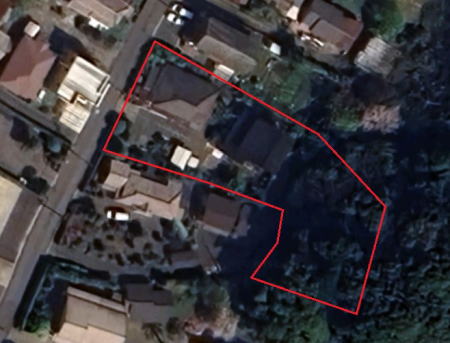 敷地425坪 西側道路に面し東西に長い地形 西側に古民家、中央に母屋、東側に山林