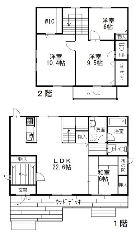 22帖LDKと小上がり6和和室続き間 南側全面にウッドデッキテラス 2階洋室3部屋