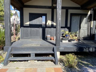 | 玄関まわりとウッドデッキテラスの様子 |