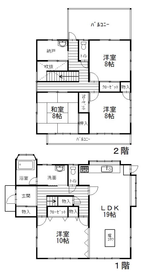 建物は平成5年築 42坪4SLDK 堀コタツ付19帖LDKと10帖洋室続き間 2階居室3部屋