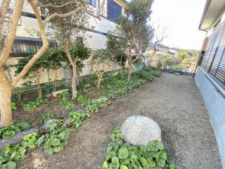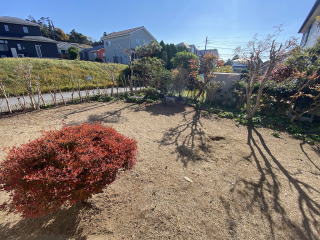 敷地132坪 東南側、北東側2方道路角地 駐車場2台可 南側の明るい庭には果樹あり