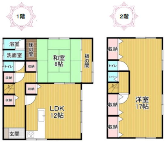 建物は昭和62年築 36坪2LDK ハウスメーカー施工の軽量鉄骨造 2階17帖洋室は分割可 |