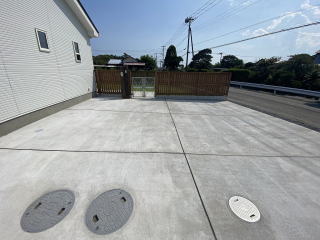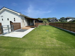 敷地119坪 西側、北側、東側の3方道路角地 大型駐車場と広々した芝の明るい庭