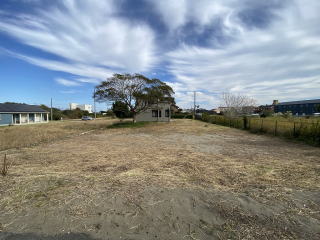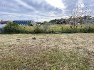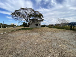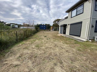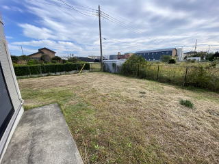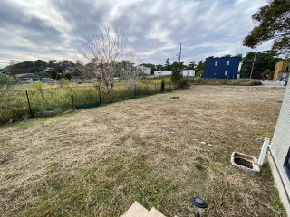 南側から西側にかけてシンプルに広い庭 中央で分割して西側半分は別目的で利用可能