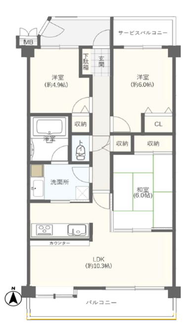 専有面積63u 3LDK 南側バルコニー 日当り眺望良好