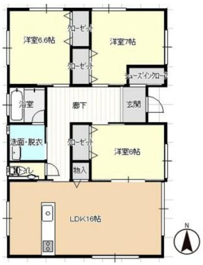 建物は新築平家の永住用住宅 26坪3LDK 天井吹抜16帖LDKと6帖洋室続き間 |